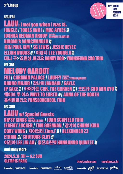 매년 고정적으로 열리는 페스티벌이 여럿 있지만 그중에서 서울재즈페스티벌을 추천하는 이유는 야외무대를 즐기기에 시기가 정말 좋기 때문이다. 2024년 서울재즈페스티벌은 오는 5월 31일부터 6월 2일까지 진행되는데, 작년 브루노 마스의 콘서트가 6월 말이었는데도 불구하고 저녁과 밤에는 덥지 않았으니 이번 페스티벌은 낮부터 공연을 즐기기에도 적당한 날씨일 것으로 예상된다(낮 공연은 자외선 차단용 얇은 외투와 선글라스를 잊지 않기를 추천 드린다). 페스티벌의 또 다른 장점은 한번에 많은 아티스트들의 무대를 즐길 수 있다는 점이다. 재즈 없는 재즈페스티벌이라는 일각의 의견도 있지만, 이는 보다 다양한 장르의 노래를 동시에 즐길 수 있고, 들어보면 ‘아, 이 노래’라고 생각할 노래를 선보이는 핫한 아티스트들의 공연을 마주할 수 있다는 장점으로 해석할 수 있다. 요일마다 라인업이 다르니 가장 마음에 드는 날짜를 골라 예매하시면 되겠다.